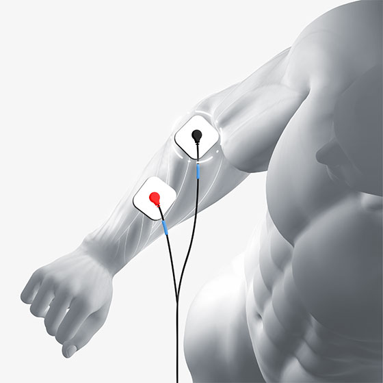 You’ll need two 2x2 Compex® electrodes for the upper forearm/extensors of the wrist and finger. To make sure you place the Compex® electrodes in the correct spot, you’ll want to flex the muscle or move around the joint near the muscle. You’ll want to place the electrodes at the top and bottom of the muscle group.